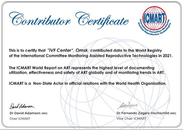 Сертификат Международного Комитета по мониторингу вспомогательных репродуктивных технологий (ICMART) подтверждает, что клиника «Центр ЭКО» Омск предоставила данные по своей статистике ВРТ во Всемирный реестр ICMART.